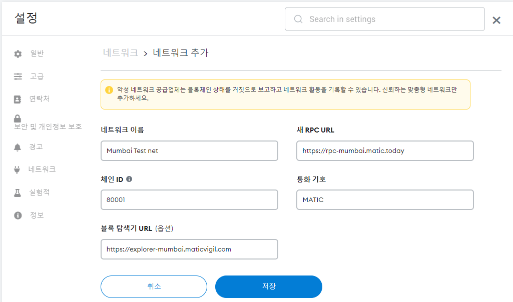 - 로그인 후 폴리곤 테스트넷을 들어간다. 폴리곤 테스트넷은 아래와 같이 설정한 후 네트워크를 추가하면 된다.