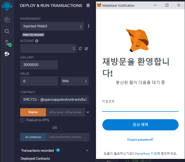 - 다음으로 Address를 가져와야 한다. 환경을 Injected Web3로 설정하면 메타마스크 로그인 창이 뜬다.