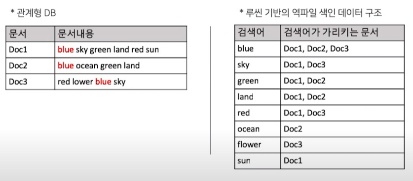 - 엘라스틱서치는 (1)루씬(Lucene) 기반의 오픈소스 검색 엔진이다. HTTP 기반의 REST API를 활용하여 요청 및 응답에 JSON을 활용해 다양한 플랫폼에서 개발이 가능하며, 정형화되지 않은 문서도 자동으로 색인하고 검색할 수 있다(Schemaless). 또한 (2)멀티테넌시가 가능하고 전문 검색 엔진을 제공한다. logstash 또는 fluentd로 로그를 변환하고 kibana를 연결하여 준실시간으로 로그를 분석하고 시각화 할 수 있다. NoSQL의 일종으로 분류할 수 있고, 기본적으로 검색엔진이지만 MongoDB 같은 대용량 스토리지로도 활용이 가능하다. - (1) 아래 그림을 보면 RDB와 루씬 기반의 데이터 구조의 극명한 차이점을 볼 수 있다. RDB는 행을 기반으로, 엘라스틱서치는 ..